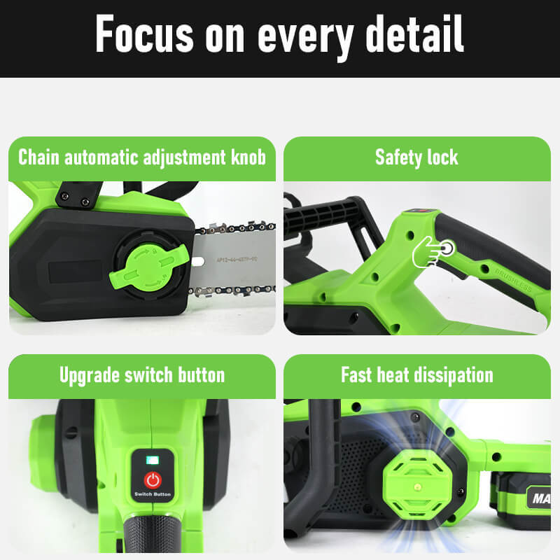 Con su sistema de lubricación automática de la cadena, obtienes un mantenimiento sin complicaciones. Ya sea que la llames motosierra de batería de 12 pulgadas o motosierra electrónica de 12 pulgadas, esta herramienta está diseñada para funcionar en cualquier trabajo al aire libre.